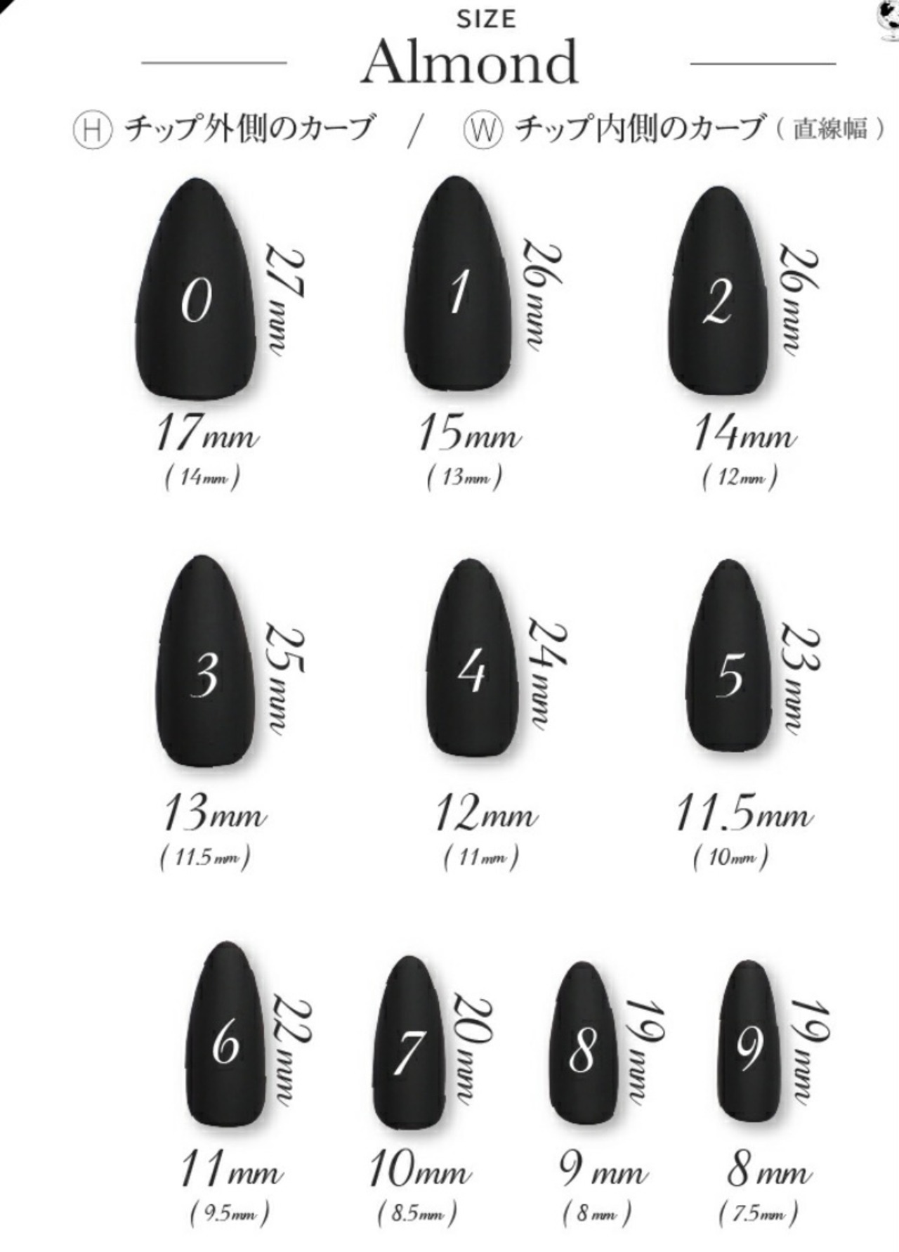お客様に合ったサイズのチップで作成するため、購入時にチップサイズをご記入ください(例:親指から右25468左25468)。