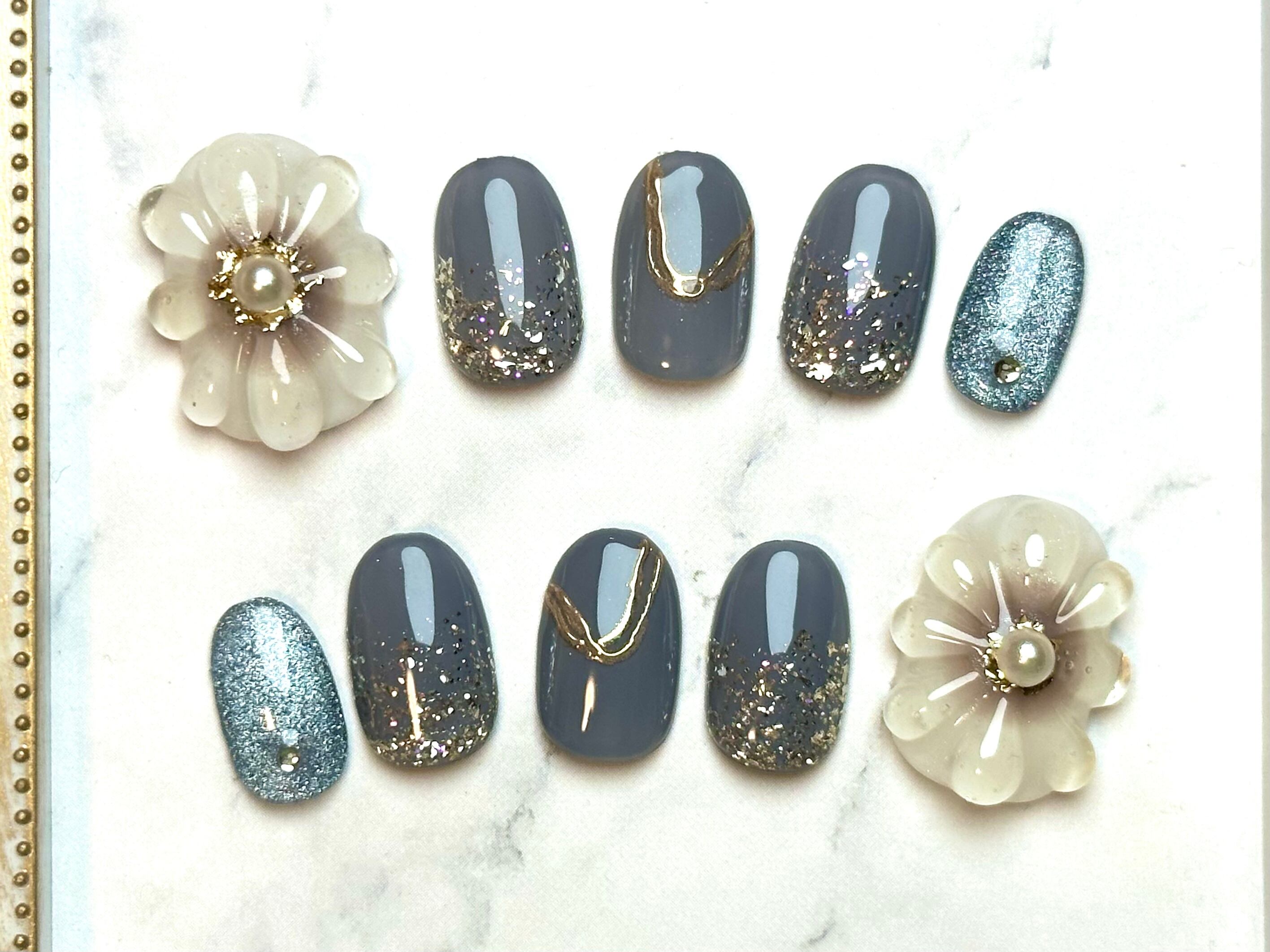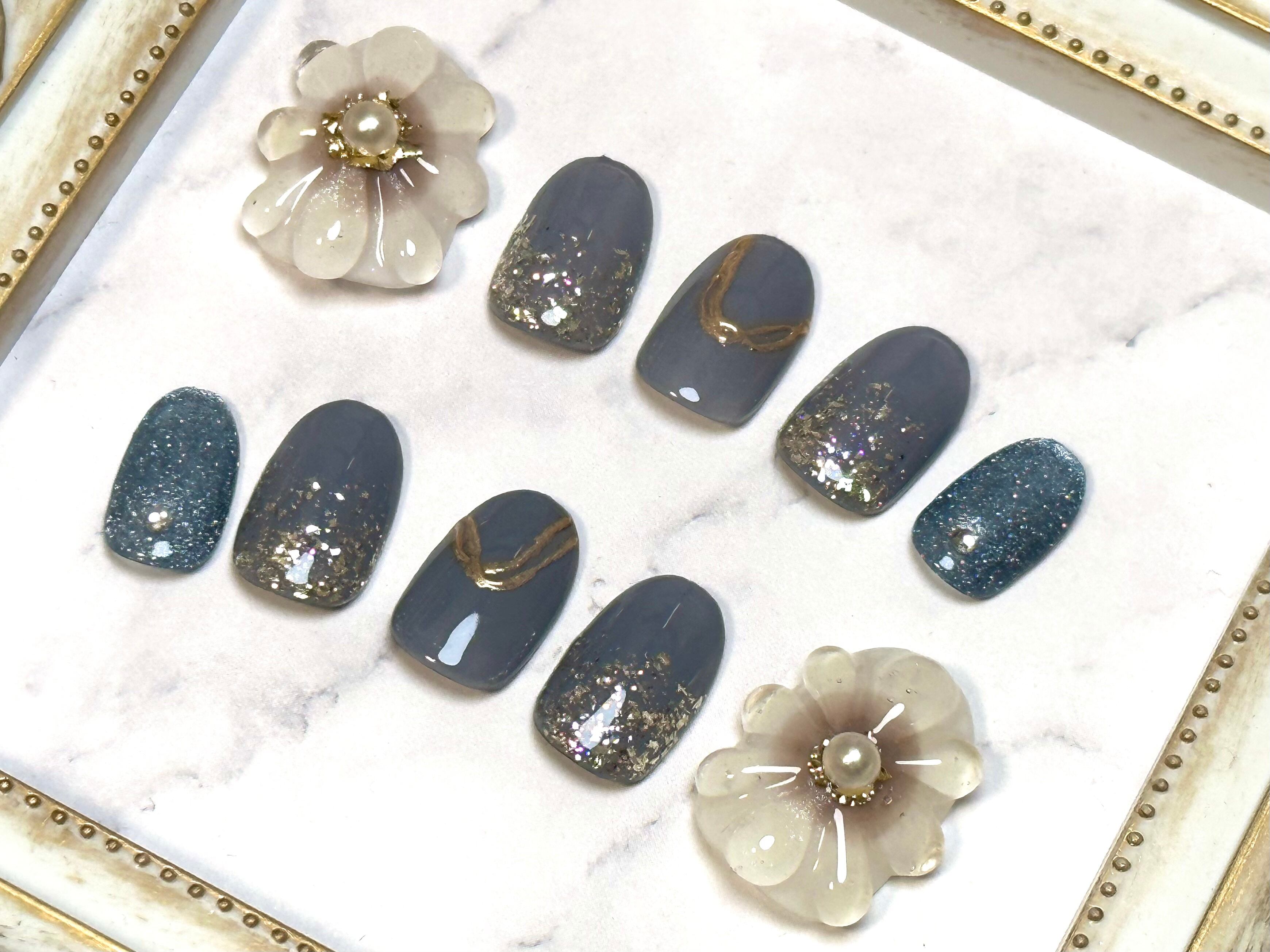 ネイルチップ*ぷっくりフラワーのグレーネイル